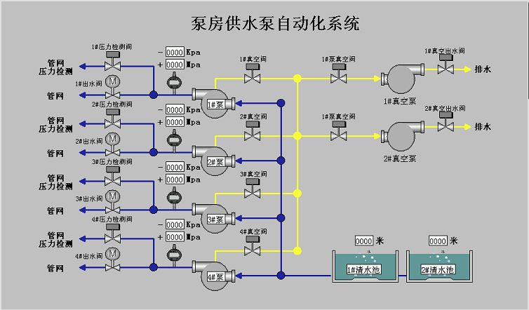 通過西門子SMART200PLC控制每個濾池的自動工作,由工業(yè)交換機組成以太網(wǎng)系統(tǒng)。主控制室由研華工控機安裝力控網(wǎng)絡版組態(tài)軟件,實際對各個濾池工作狀態(tài)的遠程監(jiān)控。計時反沖、定時反沖相結(jié)合,保證水廠產(chǎn)水的各項需要,生產(chǎn)數(shù)據(jù)設定好后,無需人為參與。
